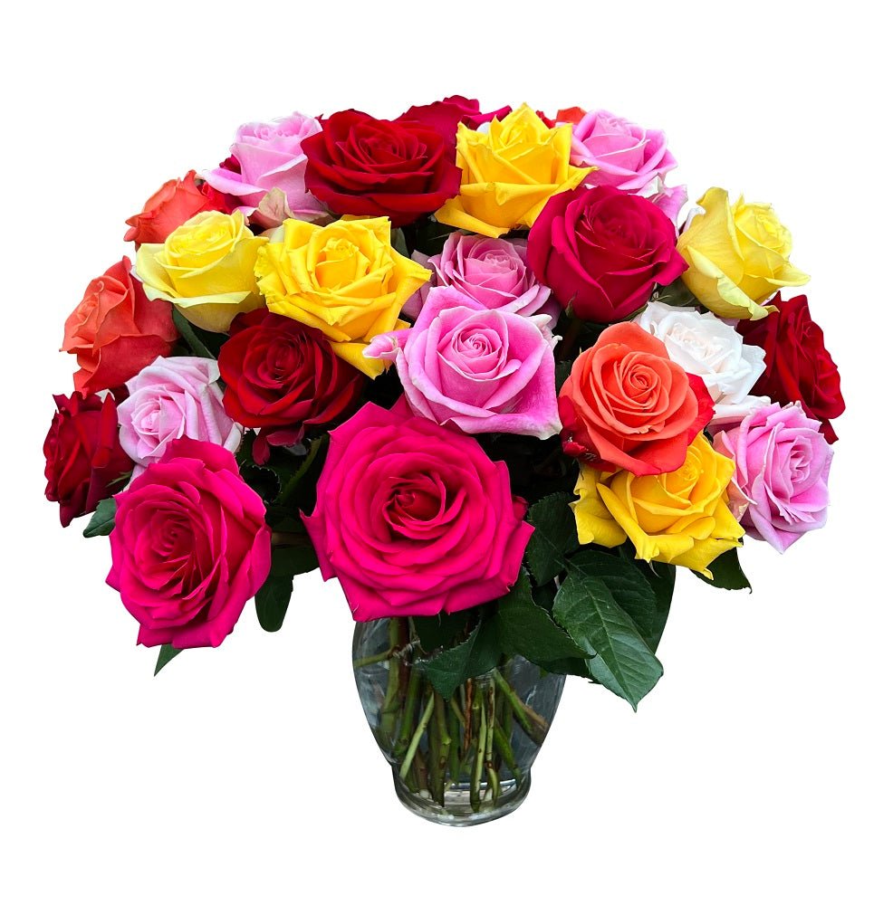 SPECIAL! Roses, roses and more roses. What a dynamite deal! Over 2 dozen assorted color roses professionally designed in a vase with delicate greens. You can't beat this amazing deal!