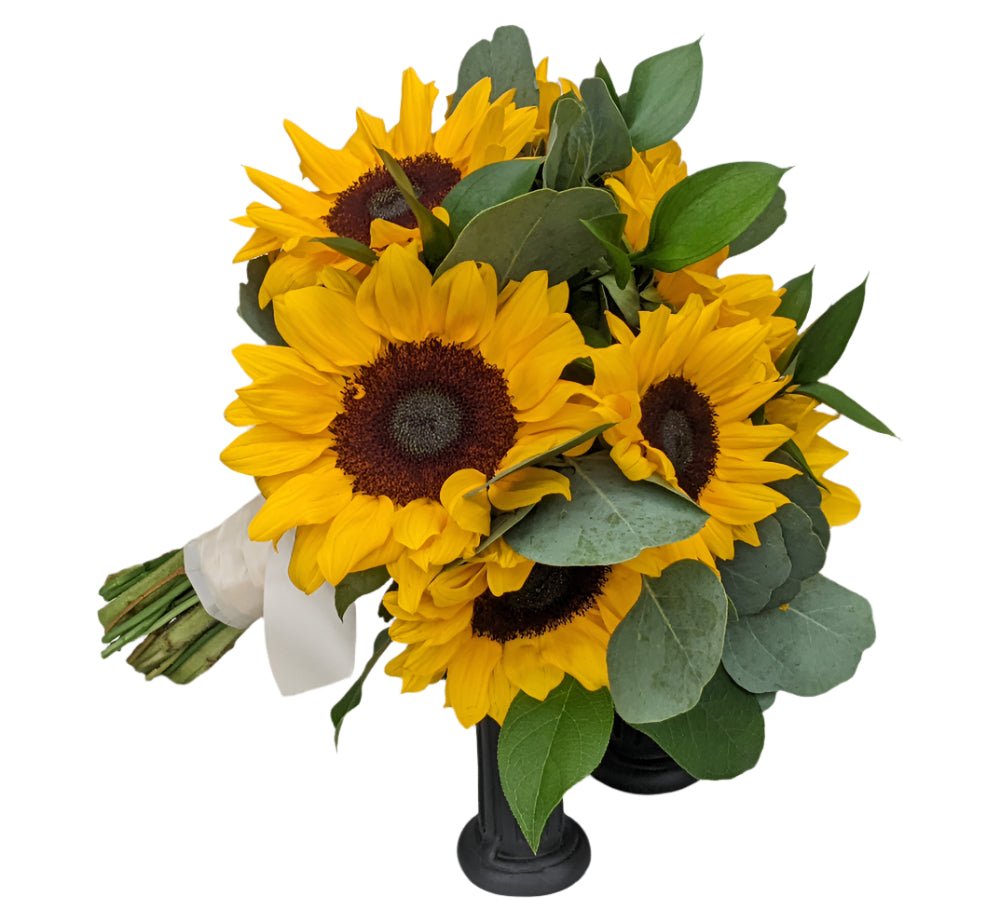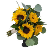 Our Rustic Sunflower Clutch Bouquet is a beautiful display of our most vibrant and luscious sunflowers accented with the ever-so-graceful seeded eucalyptus. Available in 2 sizes! No matter which style you choose, this is guaranteed to be a showstopper during any special event - proms, weddings, even anniversaries! Each ingredient is hand selected by our talented designers to create the perfect display of poise, style, and a rustic elegance, then hand wrapped together with a silk ribbon in the color of your choice. It doesn't matter what season your special day is in, this clutch bouquet is sure to complement perfectly with its naturalistic look and rustic style!