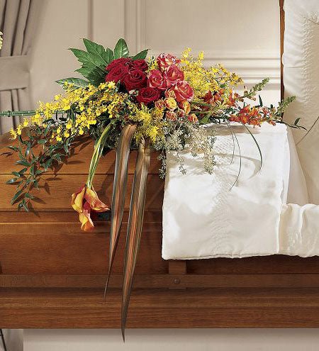 A dramatic casket spray created elegantly using Oncidium Orchids, Solidago, Roses and Mini Calla Lilies, embellished with floral stems and greens. This contemporary casket spray is intended to lay on a casket for a funeral service. In shades of bright yellows, rustic oranges, deep reds, and vibrant greens, this casket spray is the perfect way to express your love and remembrance of your beloved deceased.