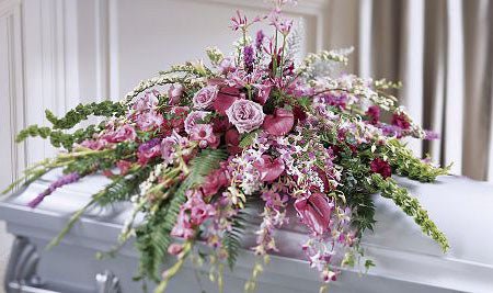 This thoughtful gesture of your sympathy displays an abundance of purple, lavender, and mint green fresh flowers on a casket spray. Using roses, orchids, gladiolas, anthuriums, nerine lilies, liatris and other outstanding flower varieties, to create a grand casket spray and send your final sympathies to a loved one.
