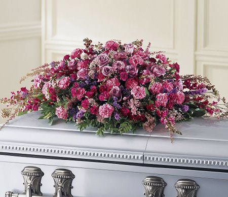 Casket spray of assorted purple and pink flowers for funeral