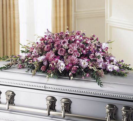 Lavender roses and orchids are featured among a background of many other glorious lavender blooms such as gladiolas, chrysanthemums, statice, and waxflowers used to create this casket spray to convey your appreciation to their memory.