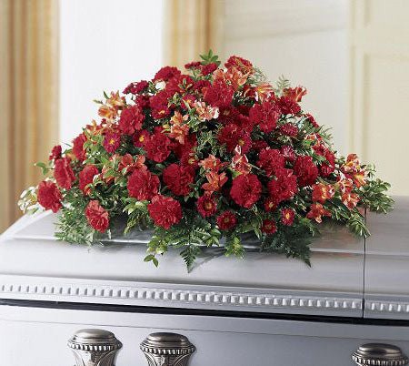 The rich red colors of this casket spray are a remembrance of one who is cherished. This traditional casket spray arrangement features carnations, alstroemeria lilies, and mastumoto asters, against a bed of greens.