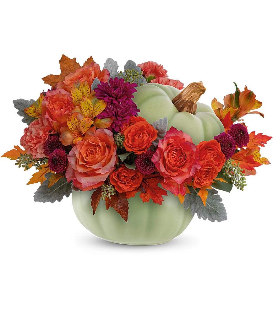 Sage Harvest is named for the pretty green ceramic pumpkin that holds this arrangement. The pumpkin, complete with a lid, holds an array of orange and purple flowers. The flower varieties may include roses, alstroemeria, carnations, and mums. This design features seasonal accents like preserved leaves and silvery foliage. Sage Harvest is a versatile gift that can be used as a table centerpiece or displayed on a coffee table or end table. Sage Harvest is a beautiful gift for anyone who celebrates a birthday or anniversary in the fall, or just loves the colorful season.
