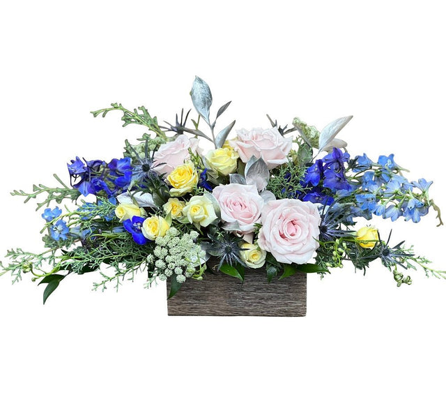 The pastel colors of our Scents of the Season Centerpiece are a fresh take on holiday flowers. Pale pink roses, yellow spray roses, and white queen anne’s lace have a soft and natural feel to them. Bright blue delphinium makes this a popular choice for holidays such as hannukah. Silver ruscus, symbolizing the metallic menorah, extends from the centerpiece to add shine. The centerpiece is a thoughtful gift for the host. Kremp Florist delivers the centerpiece in a wooden box to loved ones celebrating near or far this holiday season.