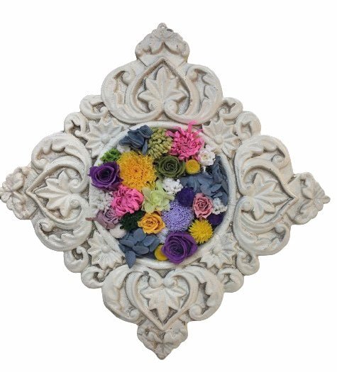 Both cool and warm tones abound in the little floral arrangement inside this 9" frame. Our artist imports these real preserved flowers that are grown in giant farms all over the world just for the preservation process. The flowers are harvested at the peak of their development and then rehydrated with glycerine and colorants. This keeps them feeling soft and pliable to the touch as the day they were picked, and keeps the color lasting for years. You'll find roses, pee gee hydrangeas, spider mums, button flowers, yarrow, spider mums, globe amaranth, star mums, statice sinuata, and panicled hydrangea in this beautiful delicate piece.