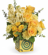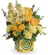 The Shimmer of Thanks Bouquet is a radiant and heartwarming floral arrangement that combines the sunny charm of yellow roses and spray roses with the delicate elegance of light yellow stock and carnations. Nestled in a stylish cube container, this bouquet exudes gratitude and appreciation. The addition of spiral eucalyptus and lemon leaf offers a refreshing and fragrant touch, making it the perfect gift to express your thanks and warm sentiments. Brighten someone's day with the shimmering beauty of this bouquet.