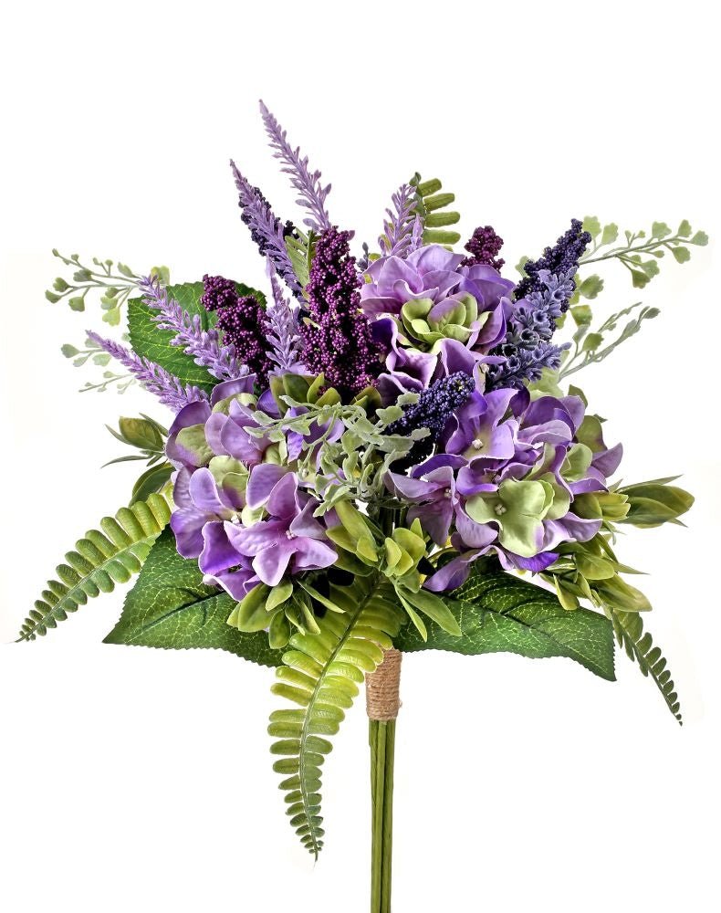 An organic-style hand tied collection of incredibly life-like artificial blooms. Pleasing tones of purple and green.