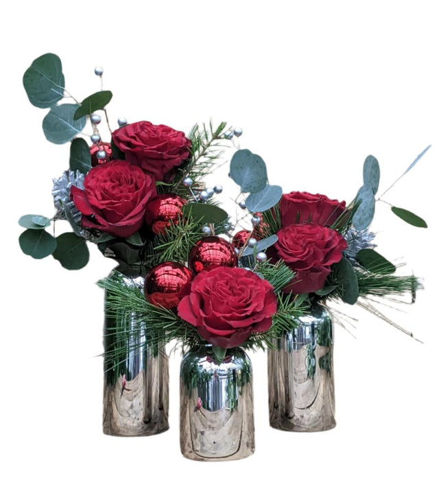 Bring on the glitz and glam with the Silver Noel Trio! This versatile set of three arrangements can be displayed together or placed throughout the home. With stunning ‘red hearts’ roses and shining ornaments, Silver Noel Trio adds fancy fun to your Christmas party.