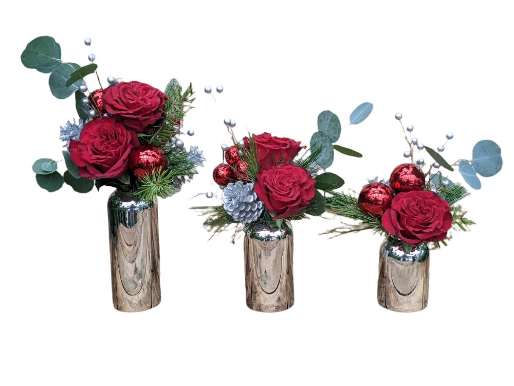Silver Noel Trio is designed in three silver vases of varying heights. Sold as a set, Silver Noel can be displayed together on your dining table or kitchen island, or placed throughout the home. Each bud vase contains 1-2 ‘red hearts’ roses that open with a beautiful swirl of petals. The classic roses are accented with glistening red ornaments and silvery pinecones and berries. The design is finished off with dusty blue eucalyptus. The trio is modern, glamorous, and festive–just the right touch for a holiday party or get together. So give Silver Noel Trio to the host with the most or your most stylish pal this Christmas.
