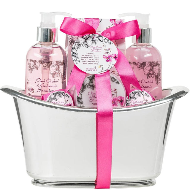 A metallic silver tub holding bath and body products that will send you on a sweet escape, while nourishing and moisturizing the body from head to toe. The aromatic scent of Pink Orchid & Balsamic Strawberry is a charming and soothing feminine fragrance believed to have healing and protective properties. A fantastic selection for any type of occasion, especially Valentine's Day, birthdays, and Mother's Day!
