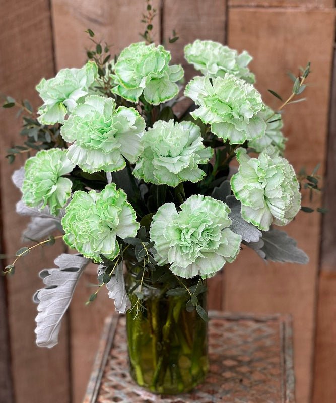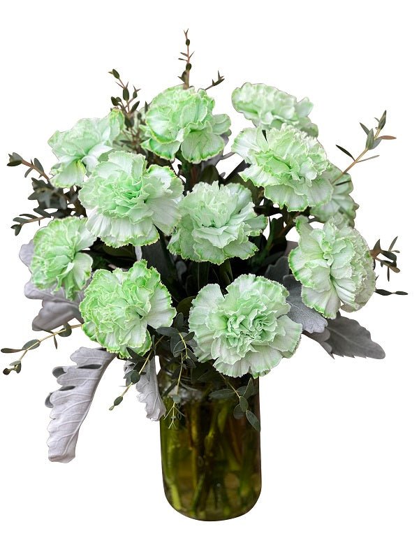 Classic "Irish" green carnations arranged in vase with delicate filler.
