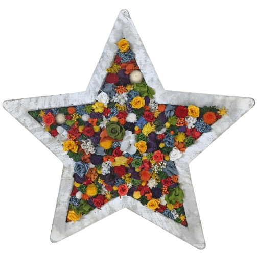 This whitewashed antiqued star encompasses a beautiful array of preserved flowers.  Preserved flowers are grown in giant farms overseas for the specific purpose of  preservation. They hold their color, shape, and pliabliity for years, unlike dried flowers  which eventually lose their color and fall apart. Most people have never heard of them  until now, but the artist hopes to spread the word, piece by piece! Included here are mini  roses, yarrow, Annabelle hydrangea, happy flowers, rice flowers, amarely flowers,  German statice, hill flowers and baby’s breath.