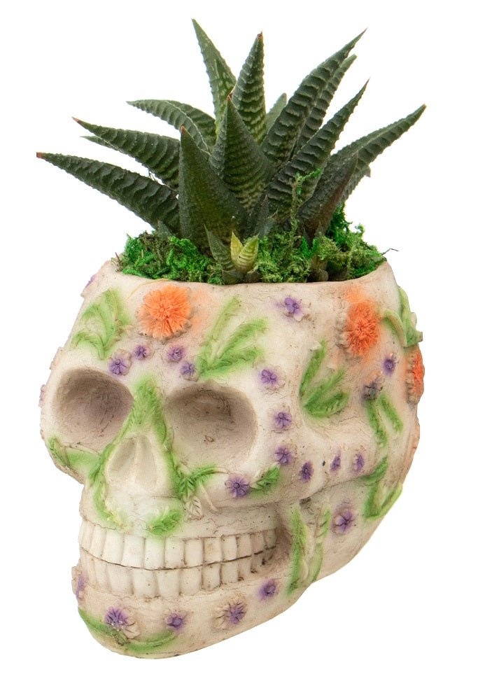 The Succulent Flora Skull is styled after the Mexican sugar skulls used to celebrate the Day of the Dead. The planter is carved with intricate flowers in muted colors. Inside the planter is an echeveria succulent that gives the look of spiky hair topping the skull. The succulent is surrounded by green moss. The Succulent Flora Skull is artistically designed and easy to care for. Give this gift for those celebrating Halloween, Dia de los Muertos, or any special occasion this fall.
