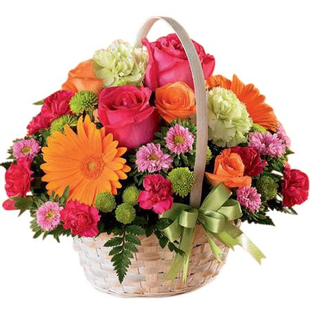 The perfect colorful fresh flower basket arrangement! Vibrant pinks, oranges, limes in a seasonal wicker basket. Brighten their birthday with this beautiful bouquet.