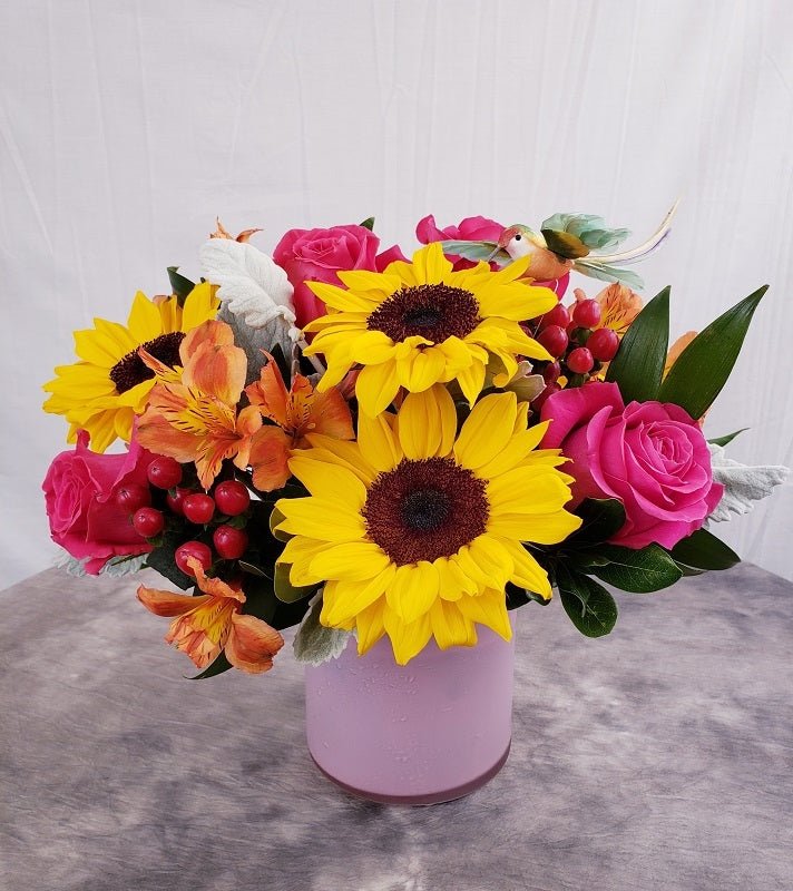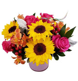 The Summer Joy bouquet is a top choice for all reasons to send flowers this Summer season. The eye-catching combination of yellow sunflowers with vibrant hot pink roses and Peruvian lilies makes this the perfect Summer centerpiece for parties and get togethers.