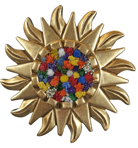 I don’t kinow about you, but I could sure use a tropical vacation! This bright and beautiful sun reminds me of white sand, clear light blue water, and the peaceful sounds of waves crashing. Who needs one of those white noise machines?! This exotic sun started out as a vintage photo frame. Measuring 8” diameter, it brings warmth and sunshine wherever you don't have much room but need a little pick-me-up! This piece includes a removable easel back, so can be hung on the wall or displayed on a shelf or table.