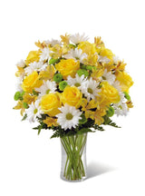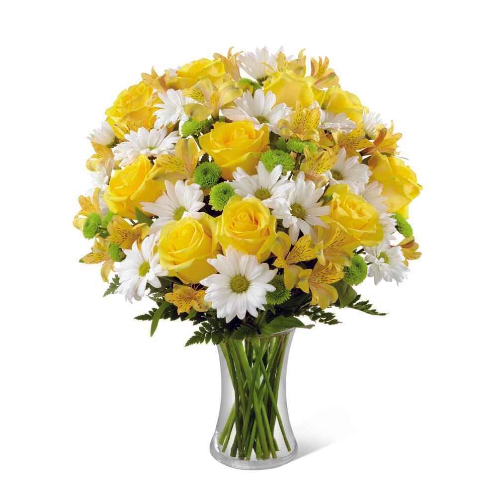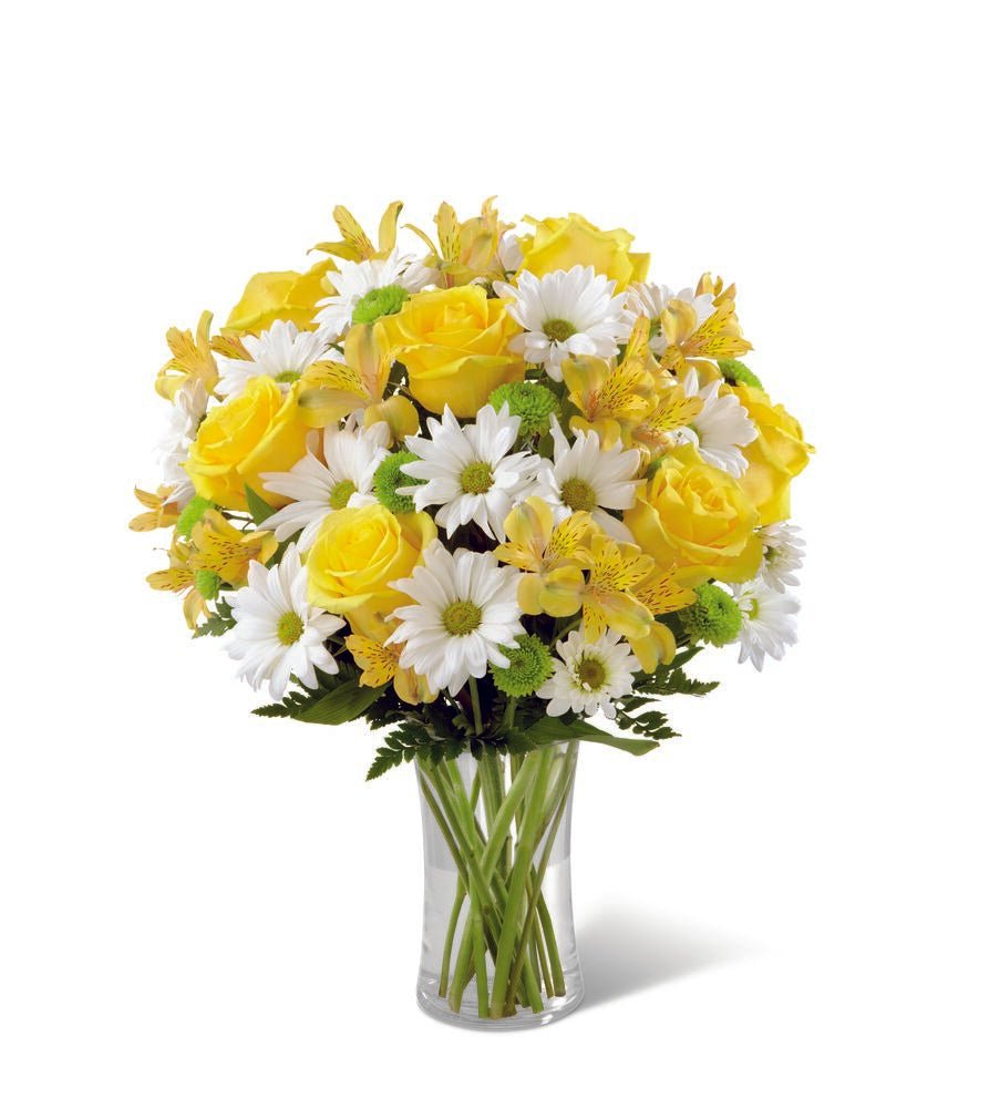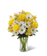 Yellow, white, and green flowers make up Sunny Sentiments. The bouquet is made with flowers like roses, daisies, button mums, and alstroemeria. The roses and mums add a pleasant fragrance to the bouquet that helps to lift spirits. The daisies and alstroemeria are long lasting flowers that give the recipient more time to enjoy Sunny Sentiments. The flowers are designed in a medium-height glass vase. The arrangement is a good size to display on a kitchen table or counter. Sunny Sentiments is a versatile gift for many occasions such as birthdays, get-well, or sympathy. Sunshine-yellow flowers make Sunny Sentiments a great choice whenever you want to bring cheer to someone’s day!