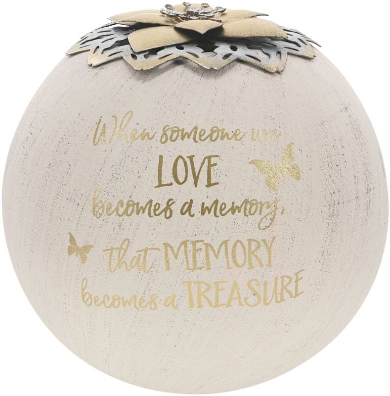 The Memory Sympathy Tea Light Holder is a cherished selection of remembrance. This selection can be purchased for yourself or be given as a gift of sympathy to express your deepest condolences to the bereaved. This interior decor accessory is the perfect size and shape to be placed upon any desktop or tabletop to add a little light of presence and love. This design features a modern styled spherical stone. The stone is a perfect circle and is accented with stylish and graceful detailing of silver and gold, complementing the surrounding atmosphere with its charismatic presence. Atop the spherical beauty is a decorative accessory in the shape of florals and patterns to hold the traditional tea light. In the center of the stone reads, "When someone we love becomes a memory, that memory becomes a treasure". The perfect reminder to reflect, love, and cherish the beautiful times spent with someone very special. A fabulous gift to give someone mourning and remembering, as well as to support and comfort after a loss.