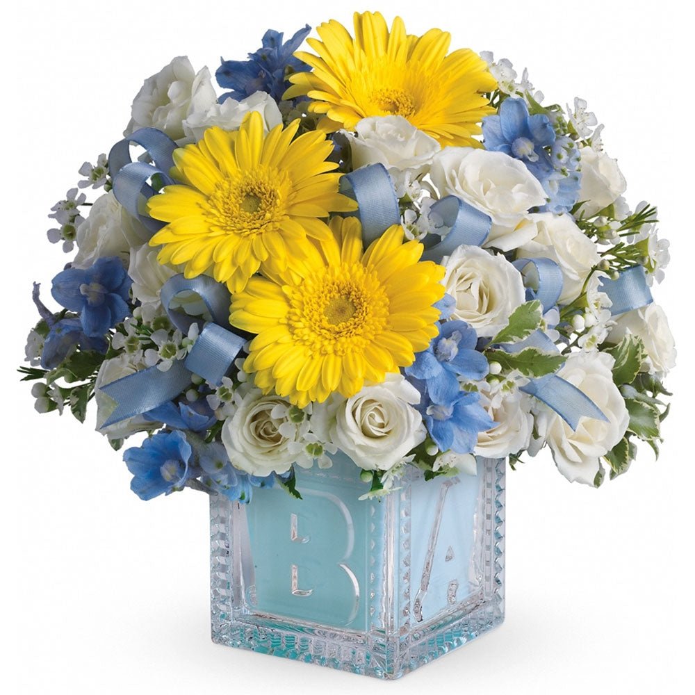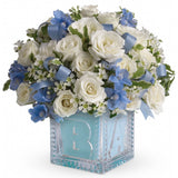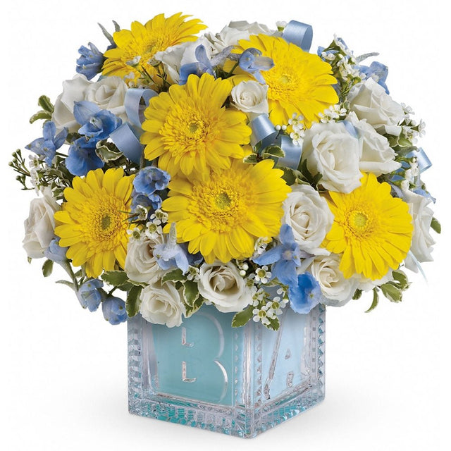 A floral celebration of a special life! This blue, white, and yellow assortment of blooms are arranged articulately within a keepsake baby block. An elegant display of excitement, new beginnings, and celebration to welcome a new baby boy to the world.