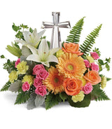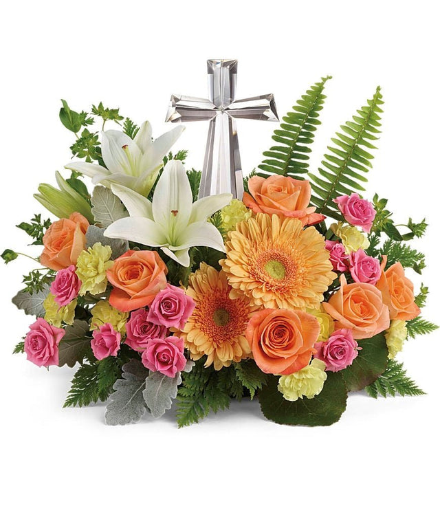 Our Precious Petals Arrangement is one that possesses a truly humbling beauty. Its grace, sophistication, and elegance shines throughout the entire room for all to see, admire, and enjoy. Our designers have selected each stem in array of vibrant pastels in order to provide a radiating presence of life and beauty throughout the atmosphere. The focal point of this inspiring design is an exquisitely crafted crystal Cross. With flowers, such as roses, lilies, gerbera daisies, spray roses, and miniature carnations, and greenery, such as bupleurum, dusty miller, galax leaves, sword fern, and leatherleaf fern, beautifully cradling this elegant keepsake cross, all who see will feel comfort and peace as well as faith and hope for what is to come. This is a beautiful selection to enjoy during Easter and Sacrament celebrations during this Spring Season, as well as to console and support your family or friends during a time of loss, illness, or hardship. Regardless of the occasion, this is one arrangement that has the power to convey true beauty and celebration of life.