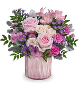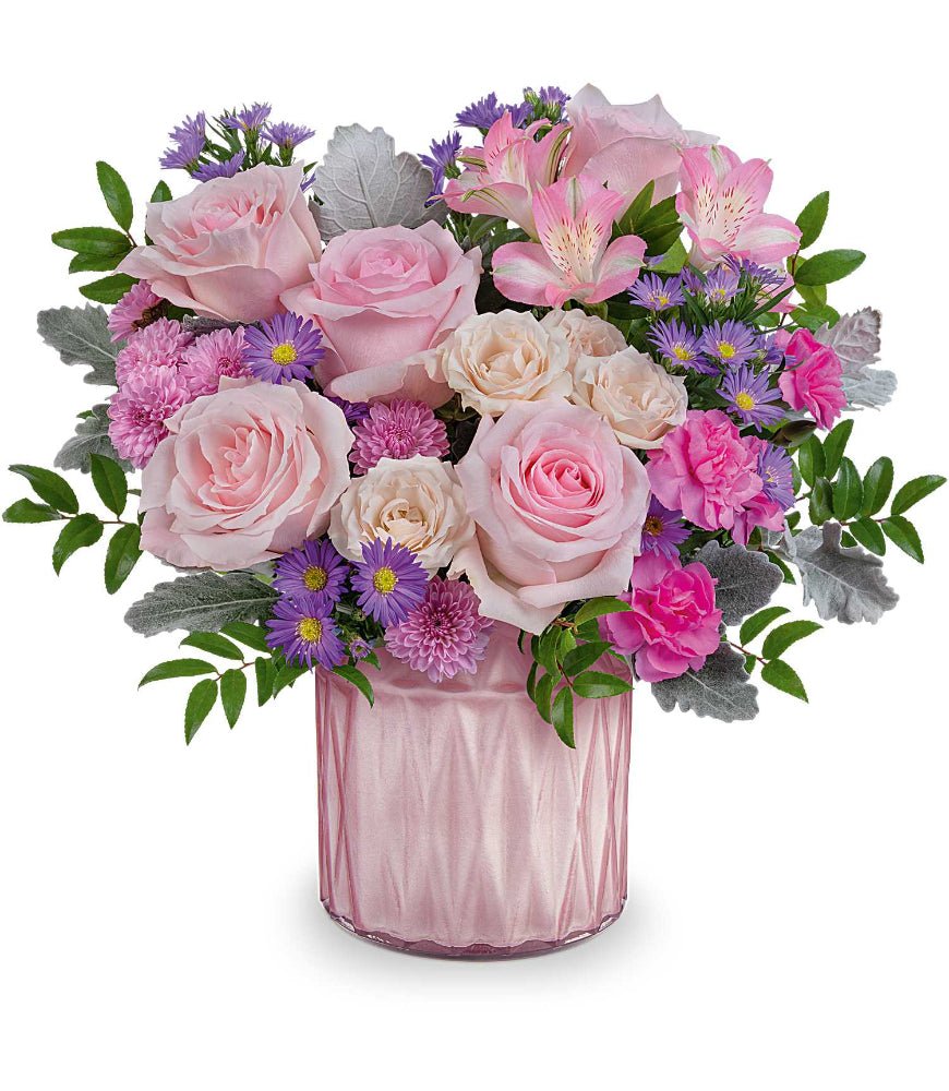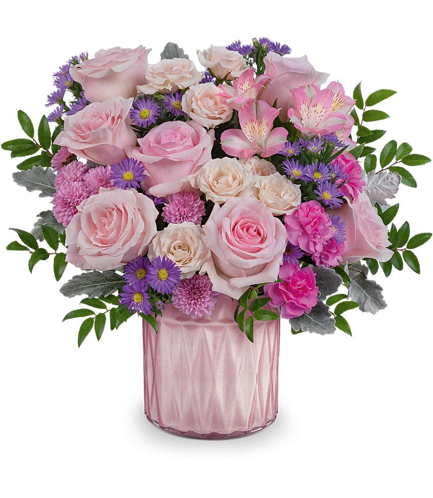 Pink roses are the feature flower in Dazzling Gem. The roses are surrounded by other pink and lavender flowers like spray roses, alstroemeria, mini carnations, and asters. The arrangement is finished with dusty gray foliage. The flowers are arranged in a low and compact style that would look good on an office desk or end table. Dazzling Gem comes in a gem-like pink vase. The weighted glass vase is multifaceted and finished with a hint of shimmer. Dazzling Gem is a modern arrangement that features many favorite flowers like roses and spray roses. Give Dazzling Gem from Kremp Florist this Mother’s Day!