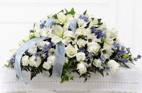 Soft blues and whites arranged in a memorable funeral flower casket spray.