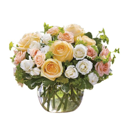 It will be a magic moment when this divine bowl of pastel roses is hand-delivered to someone special. Perfect for any occasion, the soft colors and variety of rose blossoms will soothe anyone's soul. Beautiful yellow roses, peach and white spray roses and greens are delivered in a clear glass bubble ball. The effect is magical. Spray roses are single stems that have multiple heads on them. Some may have 2 or 3 while others may have 3 or 4.