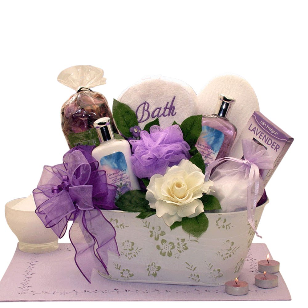 Send the Tranquil Delights Gift Basket and the recipient will be on their way to a luxurious spa retreat in the privacy of their own home. The soothing selection of spa items arrive in a luxurious embossed container. The nourishing lavender bath products include aromatherapy potpourri, refreshing body spray, exfoliating sponge and loofah ball, bath gel, soothing bath salts, hand and body lotions, microfiber bath towel, lavender scented tea light candles and more for a truly pampered gift.