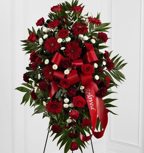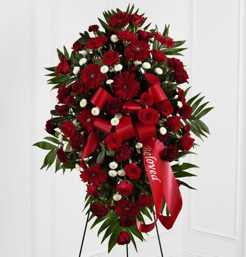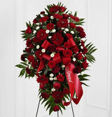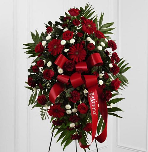 The Treasured Memories Standing Spray is a rich and colorful way to express your unending love and devotion to the departed. An exceptional arrangement of red roses, burgundy carnations, burgundy mini carnations, red gerbera daisies and white button poms are accented with a variety of lush greens. A red ribbon with the word, "Beloved," embossed in a gold metallic lettering, finishes this beautiful display for their final farewell service. Displayed on a wire easel.