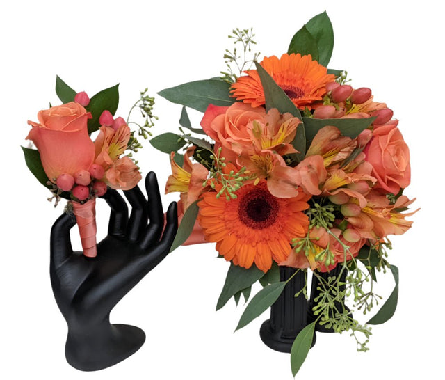 Our Tropical Citrus Prom Flower Package includes orange and tangerine colored roses, orange Peruvian lilies, peach hypericum berries, gerbera daisies, and seeded eucalyptus.  One handheld clutch bouquet and one matching boutonniere is all you need for an amazing prom or special event with your date.