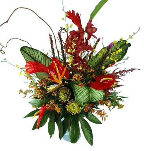 A truly unique and bold display, perfect for a foyer or entryway. Varieties of flowers may include the popular bird of paradise, ginger, anthurium, ti leaves and much much more.
