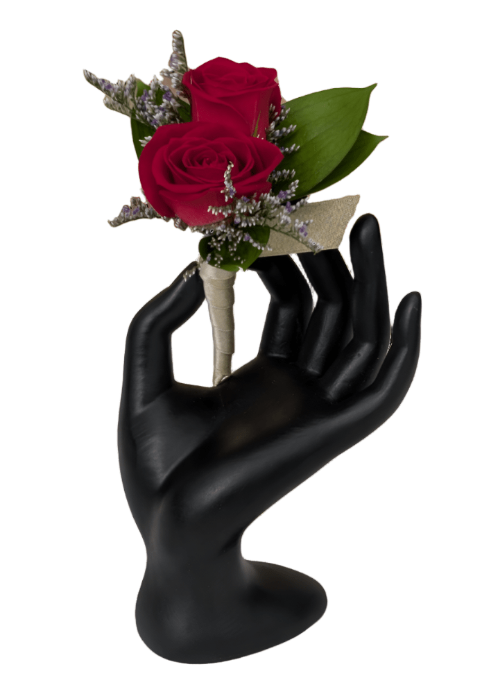 The True Happiness Boutonniere is a classic and stylish accent for proms and dances, featuring two red spray roses, delicate filler flowers, and fresh greenery, all wrapped with a ribbon stem wrap for a polished finish.