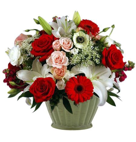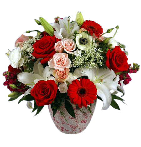 An elegant mix of gorgeous roses, lilies, spray roses, gerbera daises and much more arranged in a fancy ceramic container. This stunning and showy assortment of reds, pinks and whites is sure to please!