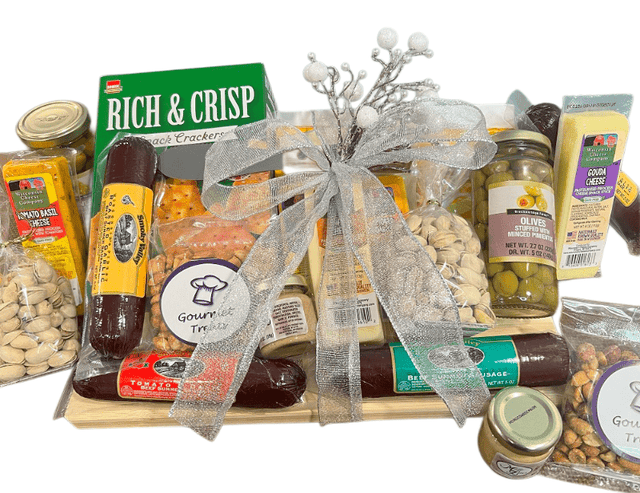 The Ultimate Winter Gourmet Gift is the perfect gourmet gift for any winter occasion.  Corporate gift giving, sympathy wishes, birthdays and get well wishes are all reasons to choose this taste collection of goodies.  Arriving on a deluxe wooden cutting board, your recipient will enjoy a delicous collection of premium snacks such as vintage cheeses, grained mustard, beef Summer sausage, beef salami, smoked gouda cheese, three pepper crackers, smoked almonds, pimento stuffed olives, deluxe mixed nuts, premium sea salt cashews, hot pepper cheese, chocolate truffle cookies and more!