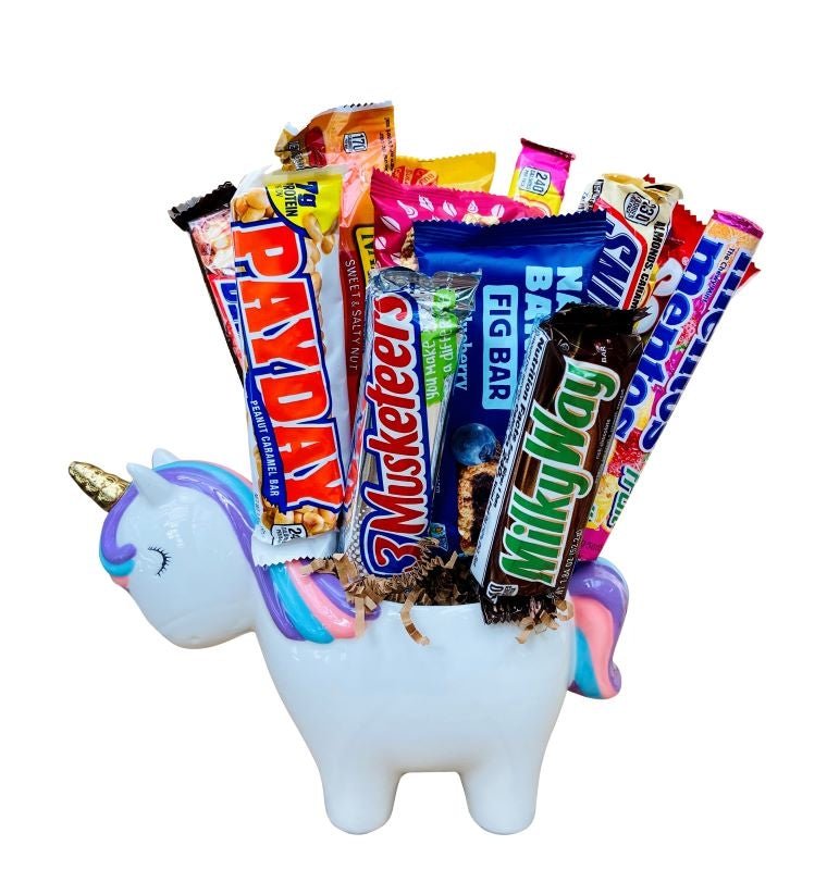 Sweeter than your favorite treat, this adorable ceramic unicorn holds a rich assortment of everyone's favorite salties and sweets. The perfect selection to celebrate a special birthday, uplift during an illness, or just to let someone special know you are thinking of them! Fun for all ages, it's a gift that can be given any time of the year for every type of occasion!