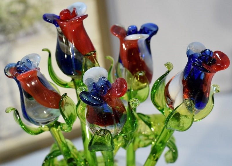 The Red, White, and Blue Glass Rose is a handmade keepsake created using the lampworking technique that allows the artist to swirl colorful glass into an everlasting rose bud. The display is completed with a long green stem with leaves and thorns. This patriotic gift can be given in honor or remembrance on national holidays such as Memorial Day, the Fourth of July or Labor Day. It is sure to be treasured by anyone who loves the United States or has served in the military.