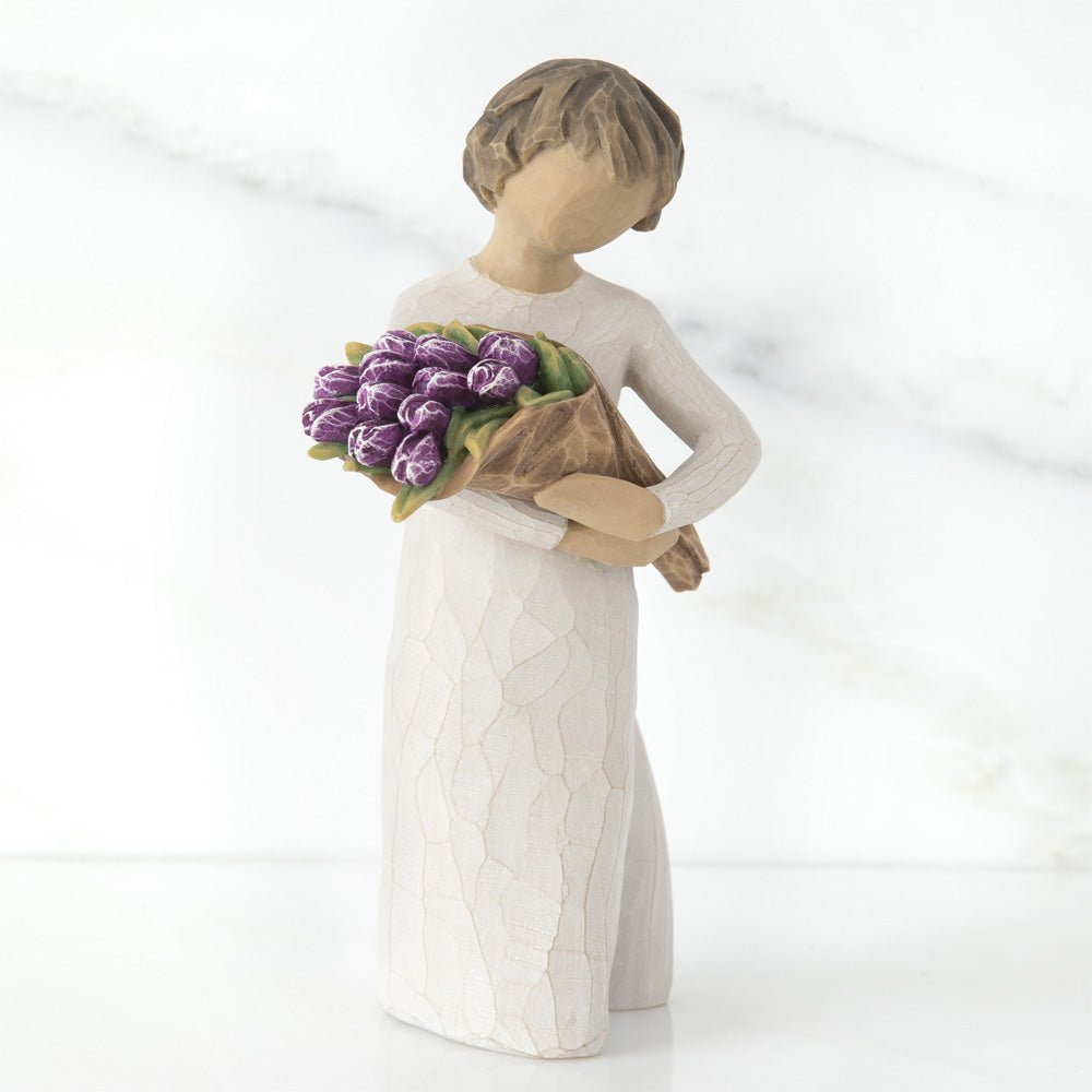 The Surprise Willow Tree figurine is the perfect little gift to add to your flowers when wanting to surprise that certain someone. From congrats to get well, there is nothing that makes someone smile more than the surprise gift of flowers. This figure stands holding a bouquet of wrapped purple tulips.