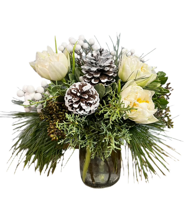 Celebrate the chill of Winter with our Winter Simplicity Bouquet.  White tulips are the focal flower in this compact arrangement with assorted winter greenery, pine cones and berries.