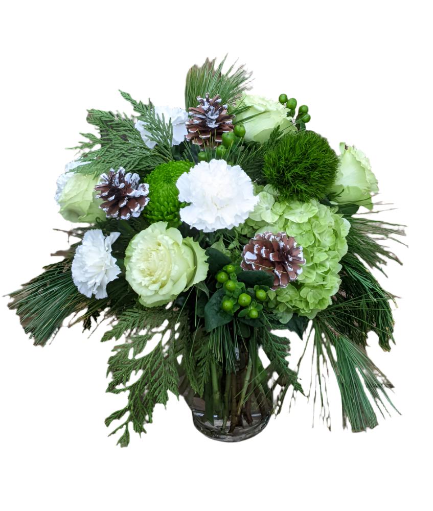 Snowy white flowers and bright pops of green make Winter Wishes a fresh and crisp arrangement. The design includes flowers like roses, carnations, hypericum berries, mums, and hydrangea. The flowers are accented by wintery touches like pinecones and evergreens. Winter Wishes is designed in a clear glass ginger vase. Like the evergreens themselves, many of the flower varieties in Winter Wishes are long lasting for even more enjoyment. Winter Wishes is an arrangement that celebrates the natural beauty of the season. It fits so many celebrations, no matter what holidays the recipient celebrates.