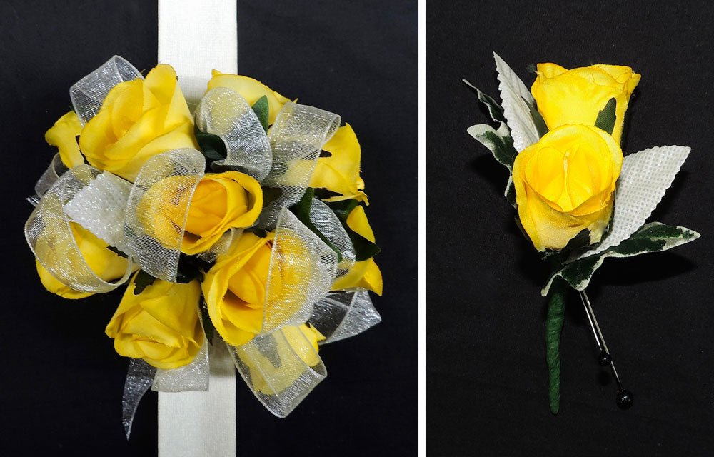 The perfect package of silk flowers for your prom, dance or special event.   Includes 1 yellow rose boutonniere and 1 yellow rose wristlet corsage as shown.